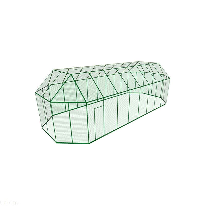 • Los paneles que constituyen la voladera están abulonados entre sí. Este sistema garantiza máxima solidez y rigidez. Es de notar que la rejilla está soldada al marco. La rejilla que se muestra en esta foto tiene una malla de 12 x 25 x 1.8 mm. (para canarios, periquitos, periquitos grandes, conuros o cotorras, y loros pequeños).